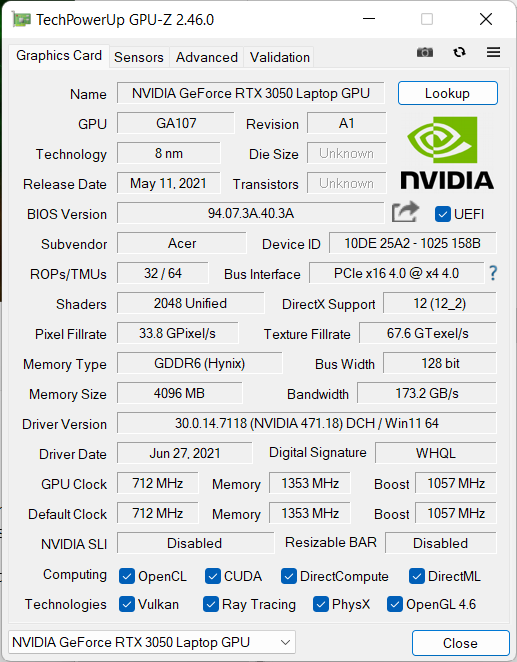 | 86.2 % v7 (old) | 07/2022 | Acer Swift X SFX16-51G-5388 i5-11320H, GeForce RTX 3050 4GB Laptop GPU | 1.8 kg | 18.9 mm | 16.10" | 1920x1080 | |