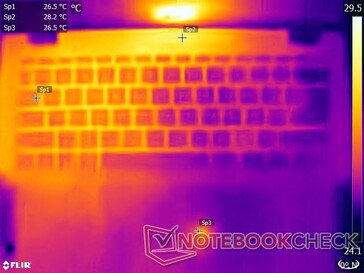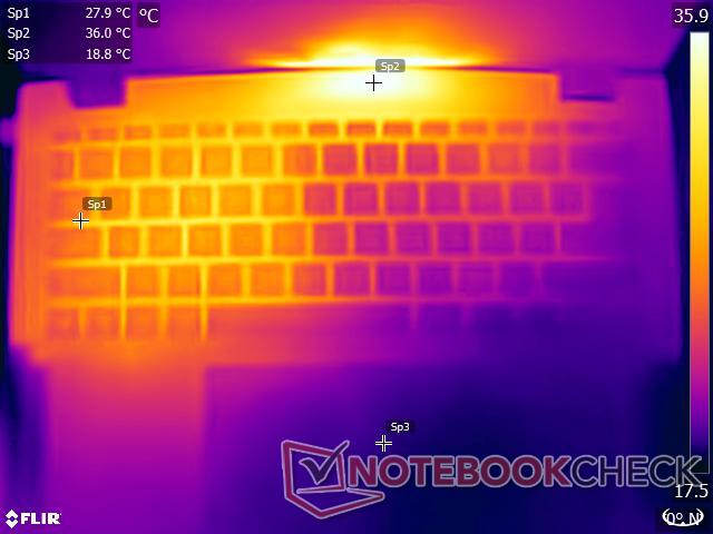 Sotto stress, le temperature più alte sono rilevate principalmente vicino alla parte anteriore in alto a sinistra e in basso in alto a destra dell'unità. Con un massimo di 43°C, non sono troppo scomode. Le aree del touchpad e del palm rest continuano a rimanere relativamente fresche, il che è un vantaggio. Si noti che è improbabile che le applicazioni della vita reale stressino il dispositivo così tanto, quindi gli utenti non dovrebbero affrontare problemi nel maneggiare il dispositivo al lavoro o usarlo in modo sicuro sulle ginocchia.