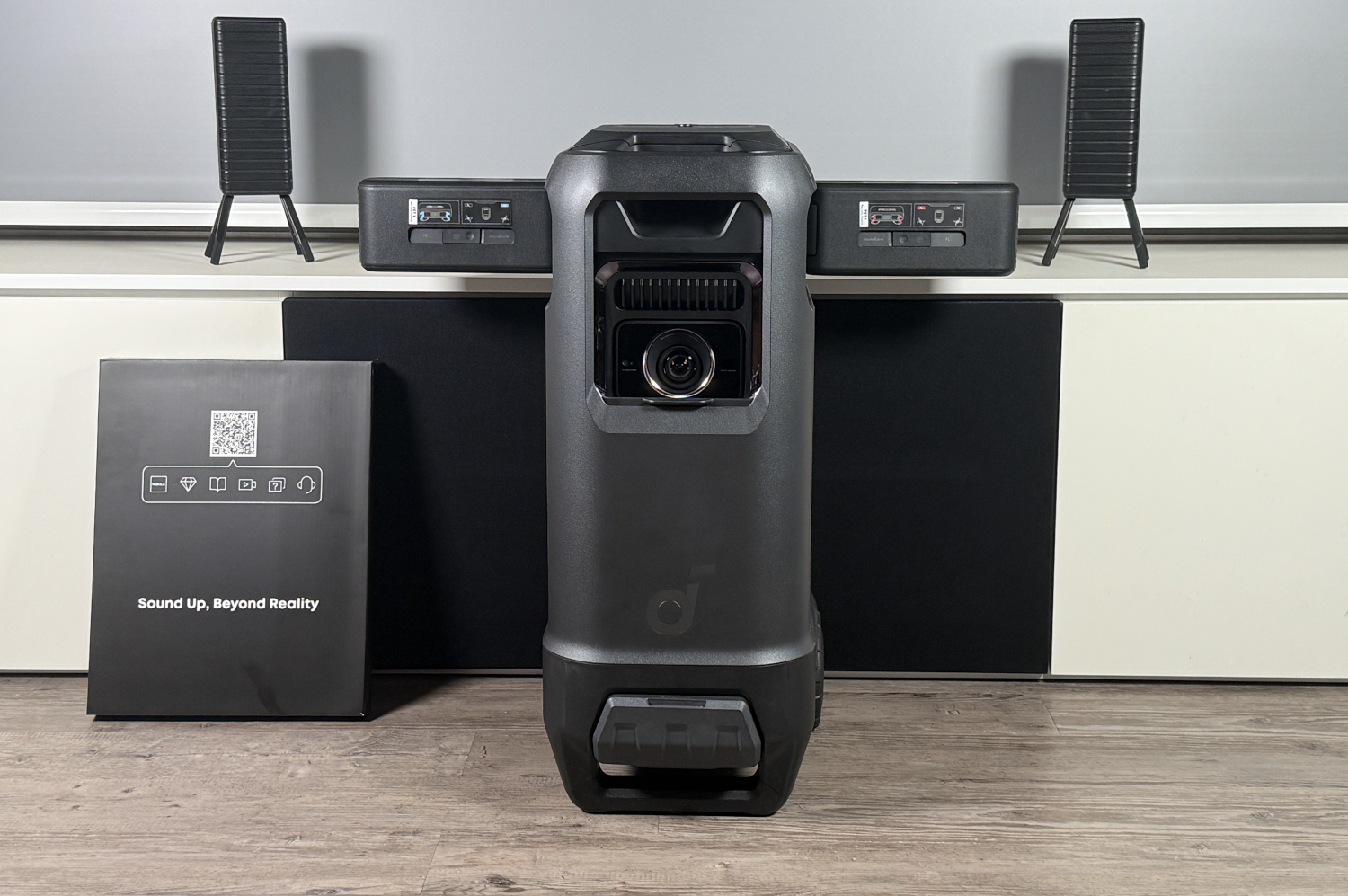 Il proiettore stesso ospita due subwoofer da 5,25 pollici. Questi occupano gran parte dell'enorme alloggiamento e forniscono bassi molto più ricchi rispetto al Nebula X1. Grazie alla tecnologia FlexWave e ai microfoni integrati, il sistema si calibra in base alle condizioni della stanza e può anche essere allineato a una specifica posizione di seduta. I diffusori sono collegati anche tramite Wi-Fi, che consente una trasmissione senza perdite con una latenza minima.