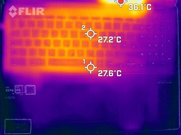 Nonostante la ventola per lo più inattiva, le temperature superficiali del portatile 2-in-1 rimangono entro i limiti. Il palm rest rimane fresco anche sotto carico.