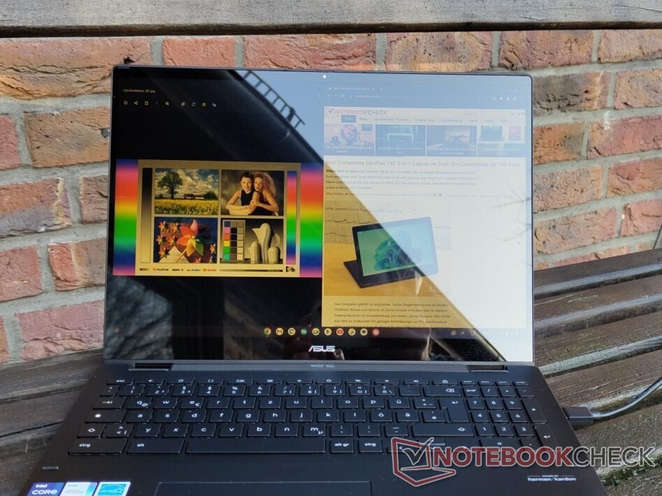 L'utilizzo dell'Asus Chromebook CX5 Flip al sole o in ambienti molto illuminati è problematico. Il display altamente riflettente non è semplicemente abbastanza luminoso da superare i riflessi degli oggetti luminosi. Tuttavia, grazie alla buona stabilità dell'angolo di visione dello schermo, il portatile può essere posizionato in modo tale da non distrarre i riflessi.