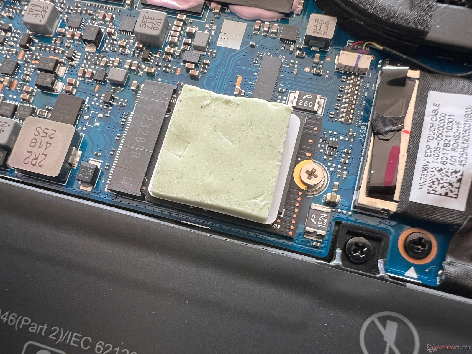 Il coperchio della base è fissato da viti Torx (T5), tuttavia la vite centrale è nascosta sotto una copertura di gomma incollata. Non siamo sicuri del motivo di questa scelta, dal momento che richiede solo uno sforzo maggiore per rimuovere la piastra di base. All'interno del dispositivo, le ventole, la batteria avvitata, il modulo Wi-Fi e l'SSD compatto M.2 2230 sono tutti facilmente accessibili. Tuttavia, la RAM è saldata.