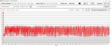 I core della CPU iniziano il nostro stress test brevemente a 4,1 GHz e consumano 95 W. La temperatura del core sale a 86 °C dopo pochi secondi, dopodiché va in throttling. Alla fine, le frequenze di clock si stabilizzano tra i 2 e i 3,2 GHz con un consumo energetico di circa 43 W, e le temperature si stabilizzano a circa 75 °C.