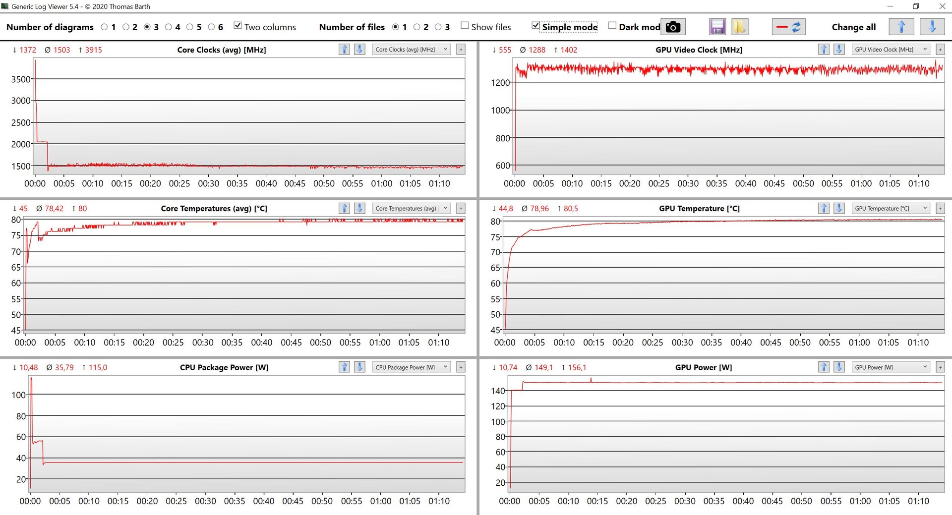 Durante lo stress test, la GPU riceve un trattamento preferenziale, funzionando stabilmente a 150 watt non appena il processore si è stabilizzato a circa 36 watt. Non c'è alcuna riduzione delle prestazioni subito dopo lo stress test.