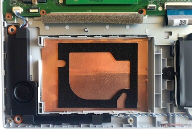 Dopo aver tolto la piastra inferiore, che è facile nonostante ci siano molti morsetti, si può eseguire qualche manutenzione: La RAM, l'SSD M.2 PCIe-3.0, il modulo Wi-Fi e la piccola batteria da 32-Wh possono essere sostituiti e la ventola può essere pulita. Si nota che quest'ultima fornisce solo aria fresca al case, in modo che la CPU stessa sia raffreddata (semi-)passivamente - più su questo nella sezione Performance. C'è uno slot HDD da 2,5 pollici con una connessione alla scheda madre, ma avrete bisogno del cavo corrispondente e del telaio di inserimento.
