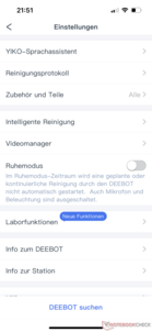 Oltre alla possibilità di regolare la quantità d'acqua quando si utilizza la funzione di pulizia, l'app di Ecovacs offre le stesse funzionalità per il modello leggermente ridotto. In altre parole, diverse mappe virtuali, zone riservate e molte opzioni di impostazione. Grazie alla funzione video basata sul display dello smartphone, è possibile accompagnare "virtualmente" il robot nei suoi spostamenti.