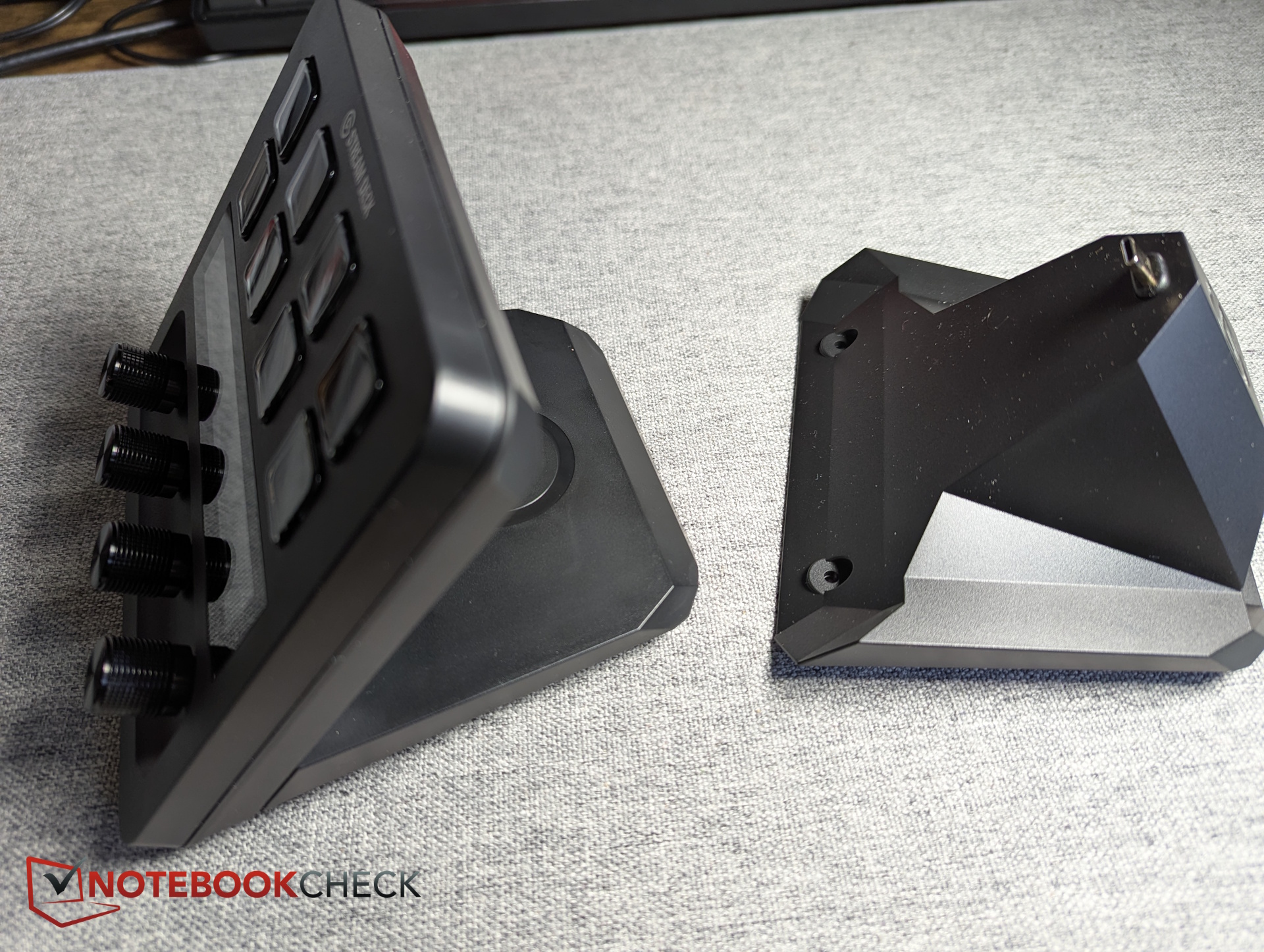 Quindi il primo passo consiste nello scambiare la piastra di base standard del Stream Deck+ con la nuova XLR Dock MK.2. Per farlo, rimuoviamo due viti, colleghiamo il dock alla porta USB-C del Stream Deck+ e avvitiamo tutto al suo posto.