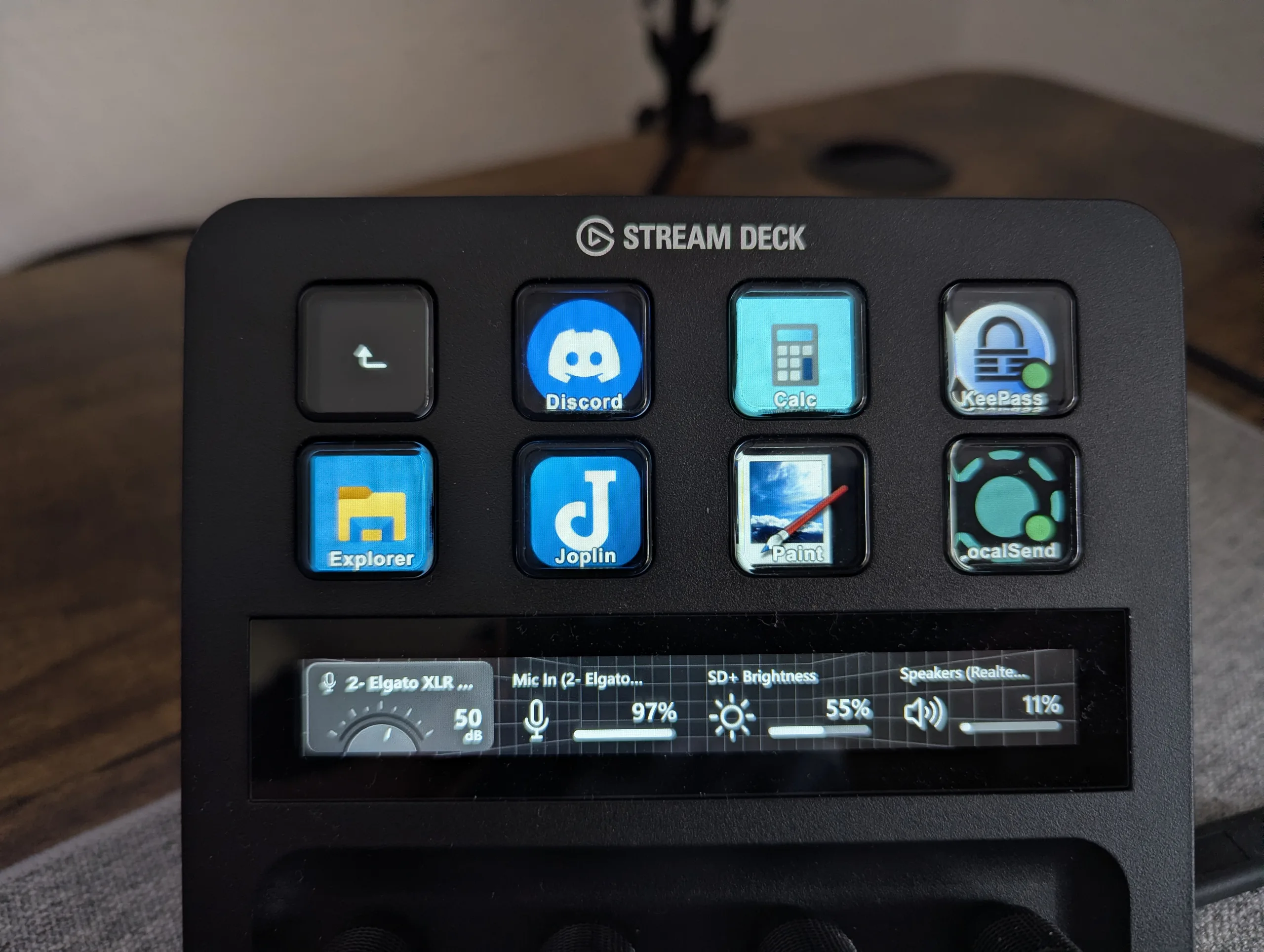 Quindi, si imposta il microfono (un supporto o un'asta non sono inclusi), lo si collega al Stream Deck+ tramite un cavo XLR e poi si collega il deck al PC tramite USB-C. Il Stream Deck+ viene immediatamente riconosciuto e selezionato automaticamente come dispositivo di ingresso e uscita audio predefinito.
