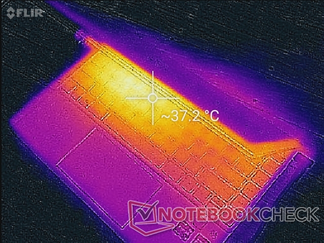 (+) La temperatura massima sul lato superiore è di 35.6 °C / 96 F, rispetto alla media di 35.9 °C / 97 F, che varia da 21.4 a 59 °C per questa classe Subnotebook.