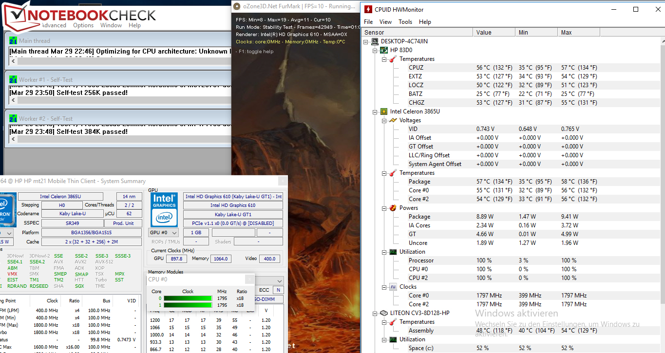 Abbiamo testato le prestazioni del Celeron 3865U utilizzando il benchmark multi-thread Cinebench R15 su un loop di trenta minuti. Il mt21 si è comportato allo stesso livello in modo coerente senza calo di prestazioni anche verso la fine del benchmark.