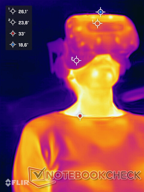 Lo sviluppo del calore delle cuffie non è un problema. Il punto caldo si trova sopra il display, ma la temperatura non era molto alta nei nostri test. Sembra che il raffreddamento passivo dell'hardware e dei pannelli funzioni sufficientemente bene. Non c'è una ventola, quindi le cuffie rimangono silenziose.