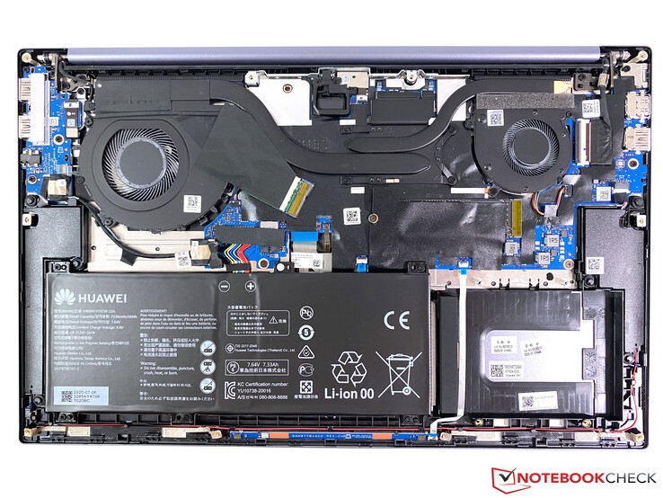 La tastiera nera chiclet corrisponde esattamente ai dispositivi di input dei Huawei MateBook 13 e 14. Lo spazio aggiuntivo ai lati non viene utilizzato per un tastierino numerico, ma per le due casse (di questo parleremo più avanti). Alcuni tasti speciali sembrano numerosi, ma nel complesso ci si abitua rapidamente al dispositivo di input. I due tasti con le frecce verticali sono solo la metà della dimensione normale, il che a volte può portare ad un input non corretto.