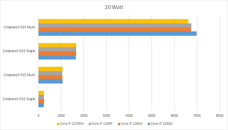 Le prestazioni in single-core dei quattro processori sono praticamente identiche a 20W e solo il Core i7-1255U è in grado di fornire prestazioni di 20W.Core i7-1255Uriesce a mantenere un piccolo vantaggio nei test multi-core.