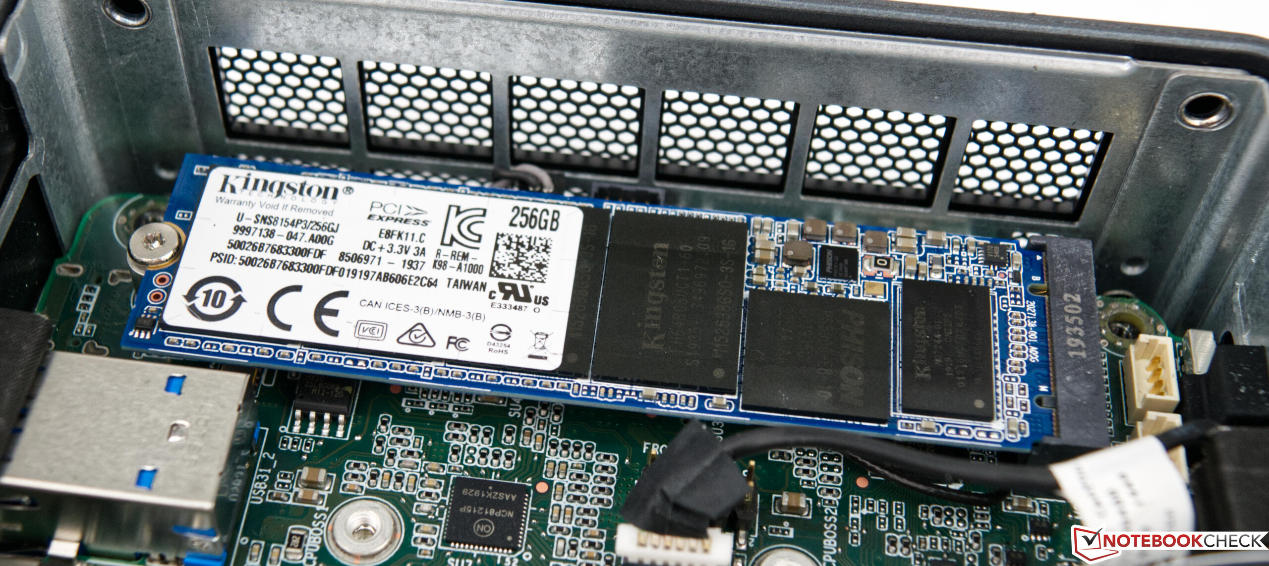 Il nostro sistema di test i7 è dotato di due dispositivi di memorizzazione. Il sistema operativo si trova sull'SSD M.2 2280 di Kingston. Dei 256 GB di spazio di memoria, l'utente avrà a disposizione ben 200 GB per i programmi di uso frequente. Oltre alla memoria flash veloce, c'è ancora spazio per un dispositivo di memorizzazione da 2,5 pollici nel NUC più alto. Nel nostro caso, è installato un disco rigido da 1 TB di Seagate, che non produce un risultato eccezionale nel nostro test a poco meno di 100 MB/s. Lo stesso vale per l'unità SSD incorporata. Utilizza l'interfaccia M.2 e offre una velocità PCI Express (PCIe x4). Ci aspettavamo però valori migliori nei nostri test. Tuttavia, l'SSD integrato non è lento e per la maggior parte degli utenti le prestazioni fornite saranno più che sufficienti. Se si acquista il dispositivo senza di memoria e spazio di archiviazione, è possibile installare un dispositivo di più veloce. Si consiglia di assemblare un sistema solo SSD invece di utilizzare il tradizionale disco rigido. In questo modo, è possibile bypassare il collo di bottiglia che quest'ultimo causa.