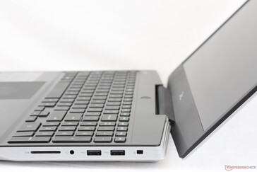 Dal punto di vista della qualità costruttiva, la base è solida con cedimenti o deformazioni minime quando si applica pressione verso il centro della tastiera o si torcono gli angoli da un lato all'altro. Non è come un Alienware m15 R2, ma è almeno paragonabile all'Asus TUF A15.
