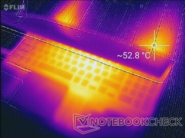 (-) La temperatura massima sul lato superiore è di 53 °C / 127 F, rispetto alla media di 40.4 °C / 105 F, che varia da 21.2 a 68.8 °C per questa classe Gaming.
