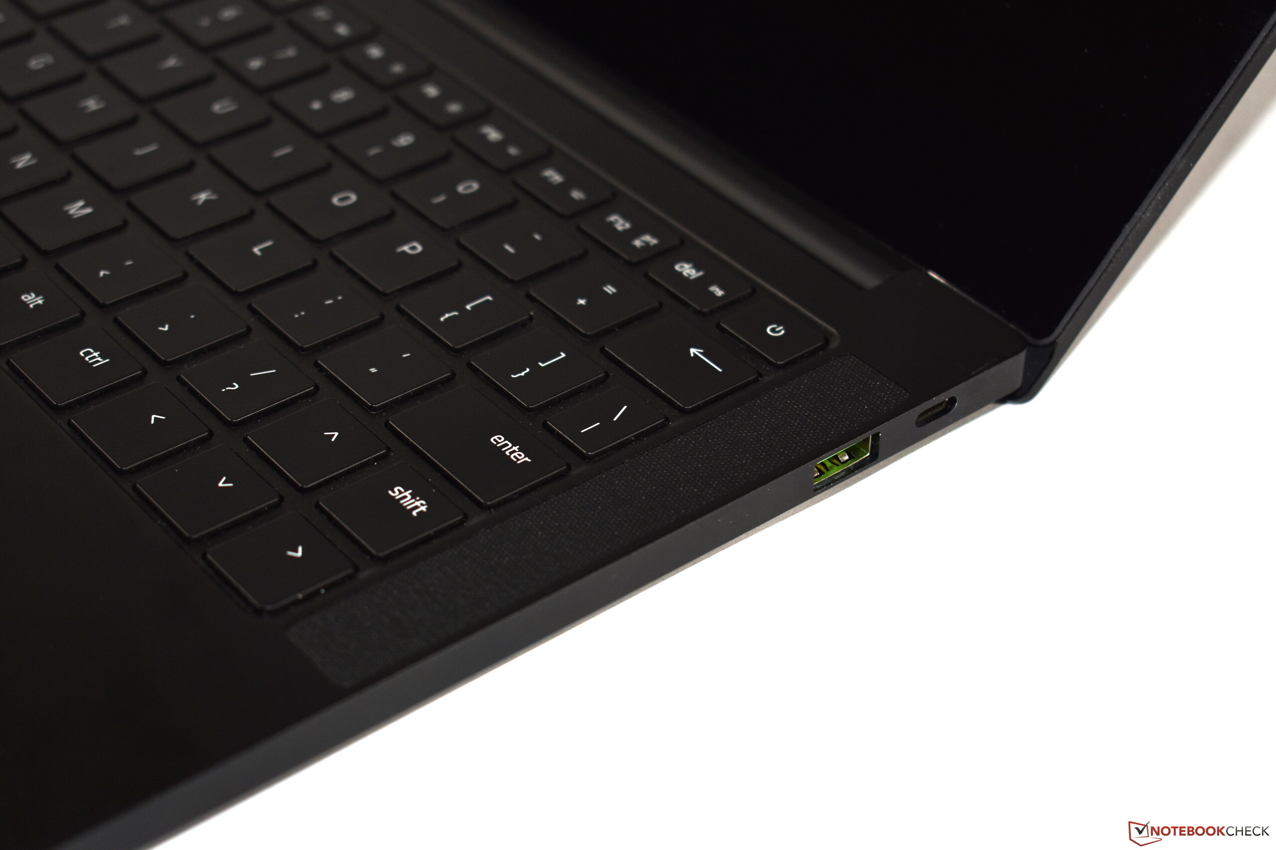 Il piccolo Razer Blade non ha il cognome "Stealth" senza motivo, in quanto il suo telaio è completamente colorato di nero. Quando la macchina è spenta, le porte USB Type-A verdi sono gli unici elementi colorati. Accesa, la tastiera retroilluminata RGB crea un tocco in più.