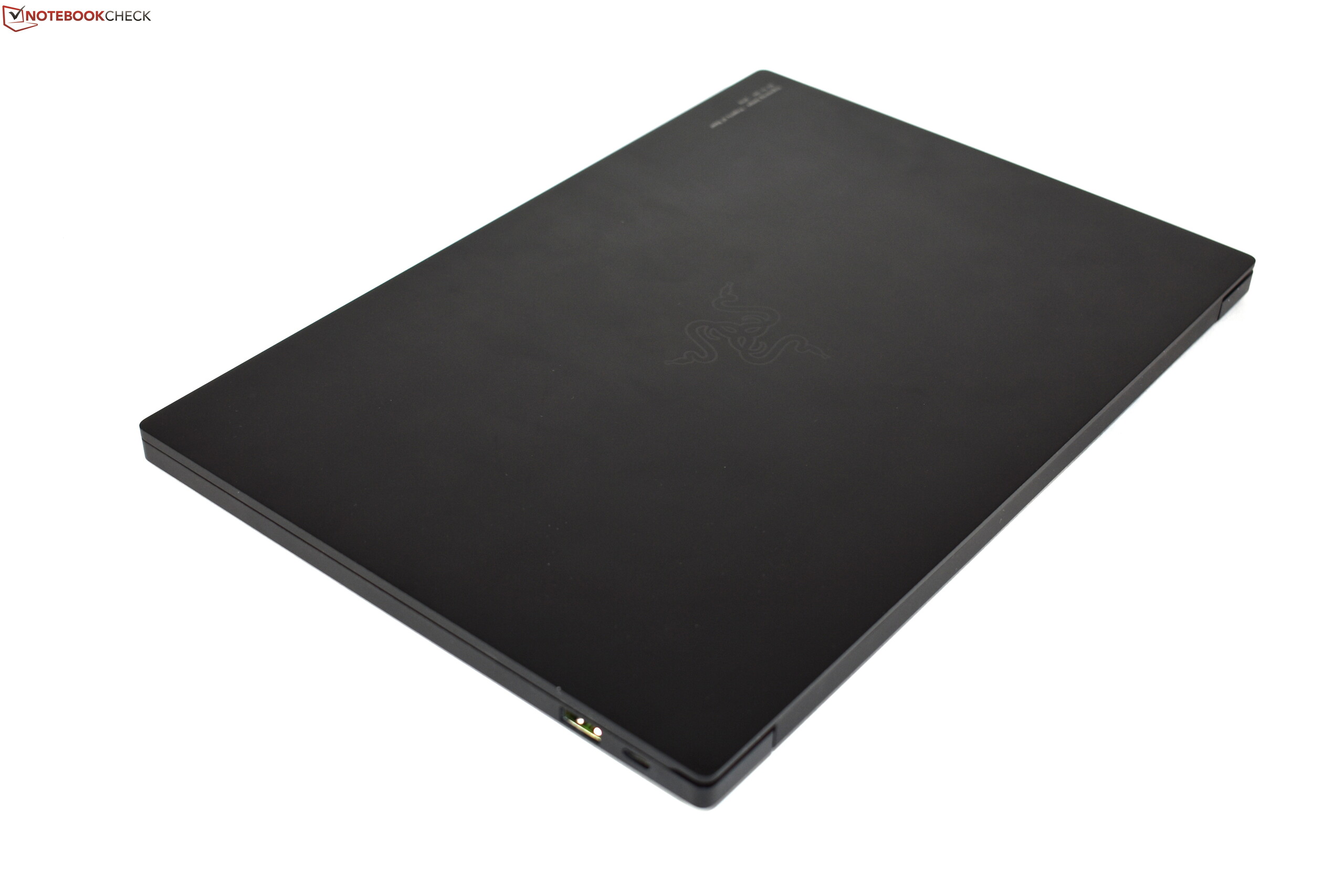 L'ampia cerniera ha un cappuccio di plastica - Razer probabilmente nasconde qui le antenne Wi-Fi. Razer ha regolato bene le cerniere in modo che lo schermo possa essere aperto con un dito. L'angolo massimo di apertura dello schermo è di circa 130° e la cerniera non permette allo schermo di oscillare.