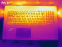 Secondo le nostre misurazioni, le superfici del portatile MSI si riscaldano fino a 50 °C (~122 °F) sotto carico. Il punto più caldo è nell'angolo posteriore sinistro della parte inferiore. La temperatura dei poggiapolsi rimane sempre moderata fino a 34 °C (~93 °F).