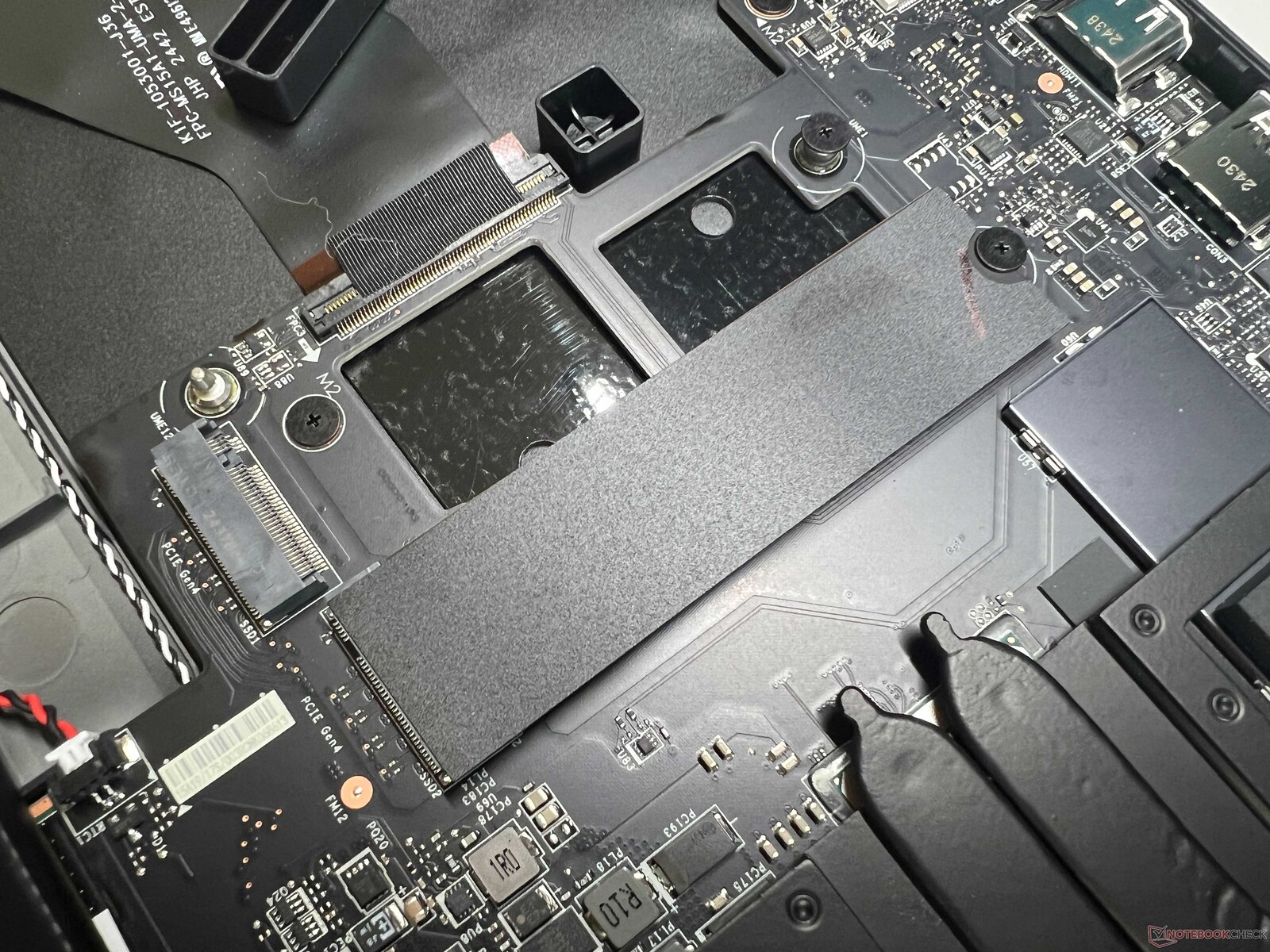 Il coperchio del telaio inferiore è avvitato e può essere facilmente rimosso. All'interno si ha accesso alla ventola, alla batteria e ai due SSD M.2 2280, ma i componenti restanti sono tutti saldati. Oltre alla grande batteria (99,9 Wh), spicca l'area inutilizzata sul lato destro del case.