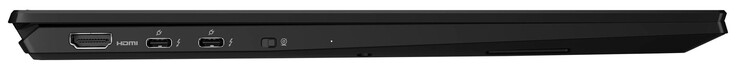 L'E16 include due connessioni USB-A (USB 3.2 Gen 2) e due connessioni USB-C (Thunderbolt 4; Power Delivery, Displayport). Il notebook da 16 pollici offre un totale di tre uscite video (2x DP, 1x HDMI). Il lettore di schede di memoria microSD appartiene ai rappresentanti più veloci del suo genere (utilizzando la nostra scheda di memoria di riferimento AV PRO SD 128 GB V60). La webcam integrata (2,1 MP, IR, max. 1920 x 1080 pixel) non ha una copertura meccanica. Al contrario, è presente un pulsante di accensione/spegnimento sul lato sinistro del case