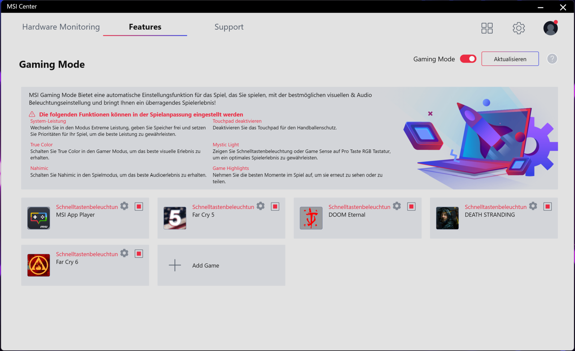 È possibile passare tra quattro profili di prestazioni utilizzando l'MSI Center preinstallato (vedi immagini) o premendo la combinazione di tasti Fn+F7. Se è attivata la funzione di livello superiore "Smart Auto" basata sull'intelligenza artificiale (come nel nostro caso), l'MSI Center sceglierà automaticamente il profilo appropriato per la situazione attuale.