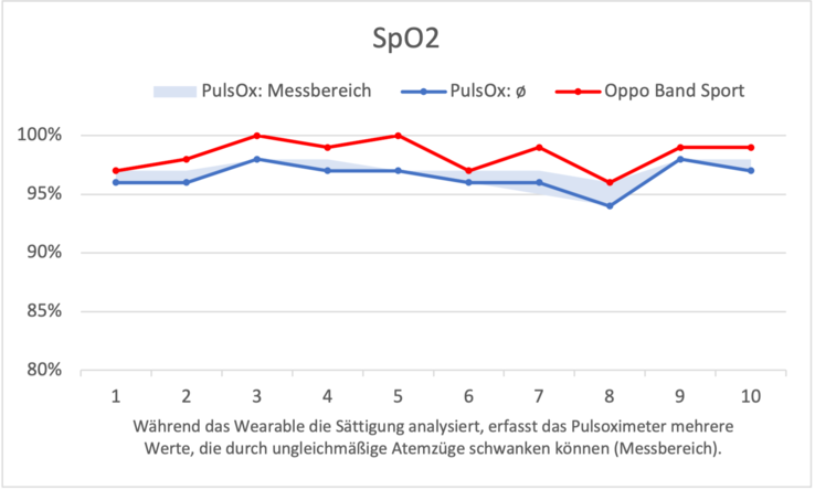 Confrontiamo la saturazione dell'ossigeno nel sangue con il risultato della misurazione di un pulsossimetro in diverse corse. L'Oppo Band Sport misura una saturazione più alta rispetto al dispositivo certificato dal medico in tutte le 10 misurazioni. Nell'intervallo limite intorno al 90%, un falso valore superiore potrebbe perdere l'effetto di avvertimento che normalmente deriva da un risultato inferiore al 90%.