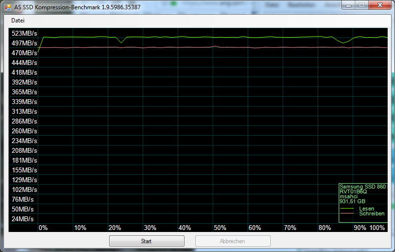 Inoltre, le velocità di scrittura sono nuovamente aumentate. Il 960 Pro raggiunge ancora velocità di lettura più elevate, ma il nuovo Evo Plus ha velocità di scrittura significativamente più elevate. Inoltre, i nostri screenshot qui sotto mostrano la differenza nel comportamento di compressione tra il modello 860 Evo basato su SATA e il 970 Evo Plus basato su PCIe.