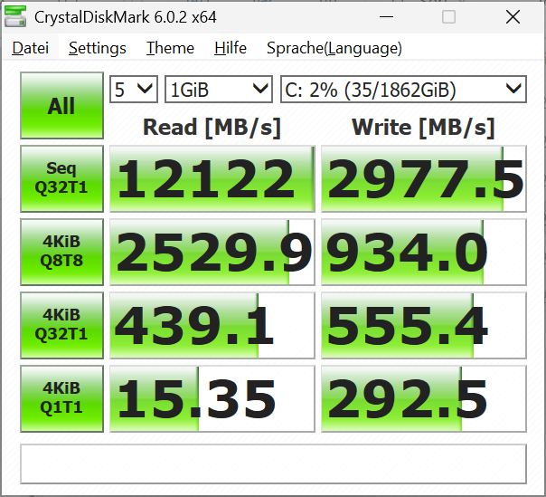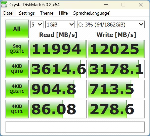 Tuttavia, questo vale solo se viene garantito un raffreddamento adeguato. A quanto pare, gli SSD PCIe 5.0 sono ancora più caldi dei loro predecessori. L'adesivo in grafene da solo non è sufficiente, soprattutto in una custodia per laptop molto stretta. Il calore risultante inizialmente ha causato un calo significativo delle prestazioni. Solo con l'aggiunta di cuscinetti di raffreddamento e il contatto con il telaio del laptop è stato possibile dissipare il calore, consentendo a T-Force di sfruttare appieno il suo potenziale di velocità. Se lo strato di grafene fornisca un reale beneficio o sia principalmente una trovata di marketing, non può essere determinato in modo definitivo da questo test.