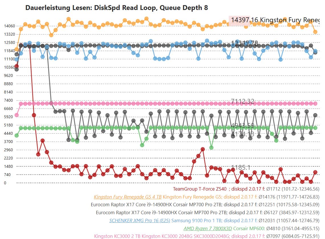 Anche nel nostro test di resistenza con DiskSpd, il T-Force Z540 ha mantenuto prestazioni costantemente elevate. Non è in grado di eguagliare la velocità dell'SSD Kingston Fury Renegade G5ma i risultati sono ancora straordinariamente forti