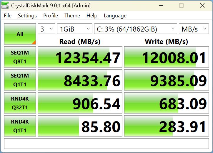 Al secondo tentativo, i risultati sembrano molto migliori: secondo CrystalDiskMark 6, l'unità raggiunge quasi 12.000 MB/s sia in lettura che in scrittura, un risultato impressionante. CrystalDiskMark 9 mostra numeri ancora più alti, mentre l'AS SSD è un po' più limitato.