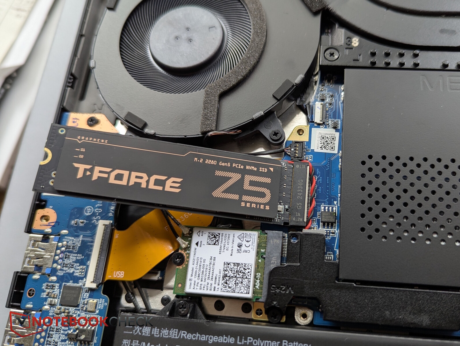 Quindi rimuoviamo la memoria principale del notebook e inseriamo la nostra T-Force Z540. Inizialmente, abbiamo escluso la piastra di raffreddamento di XMG - che normalmente si collega allo chassis tramite un pad termico aggiuntivo - e ci siamo affidati esclusivamente all'adesivo in grafene incluso per il raffreddamento.