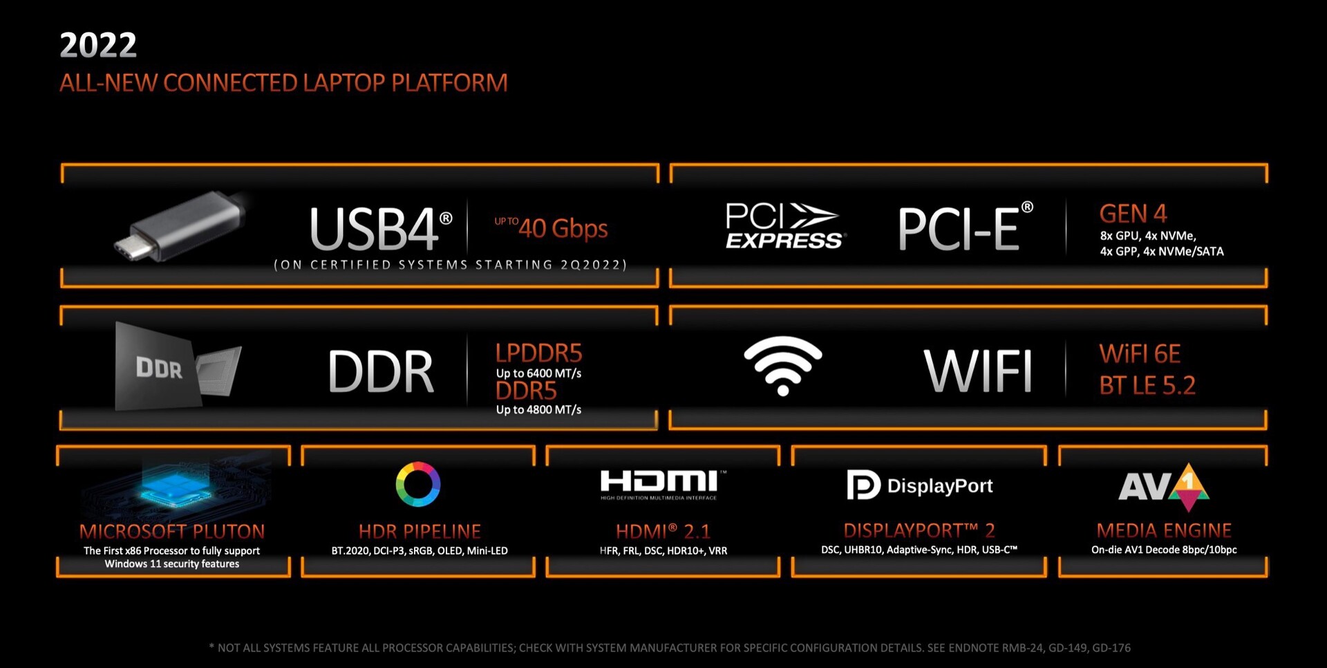 I clienti possono anche aspettarsi progressi in termini di funzionalità. Oltre alla memoria LPDDR5-6400 veloce, il sistema supporterà USB 4 (inclusa la compatibilità con Thunderbolt) con velocità fino a 40 Gbps, Wi-Fi 6E e SSD PCIe 4.0 veloci, per cui non ci sono svantaggi rispetto ai sistemi Intel. Diamo un'occhiata più da vicino alla nuovaRadeon 680M iGPUin un articolo separato.
