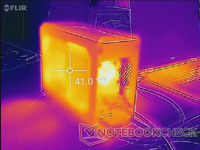 Le temperature di superficie sono generalmente nella bassa gamma di 30 C durante il gioco. Gran parte della superficie è dedicata alla ventilazione per un raffreddamento ottimale, ma ciò significa anche che gli utenti devono lasciare ampio spazio su tre dei quattro lati dell'eGPU per il massimo flusso d'aria. Ad esempio, non sarebbe saggio posizionare l'unità direttamente contro una parete o su un fianco. L'unico posto che gli utenti dovrebbero evitare di toccare è la parte posteriore dell'unità più vicina al ventilatore PSU in quanto questo posto può diventare più caldo di 40 C durante il gioco.