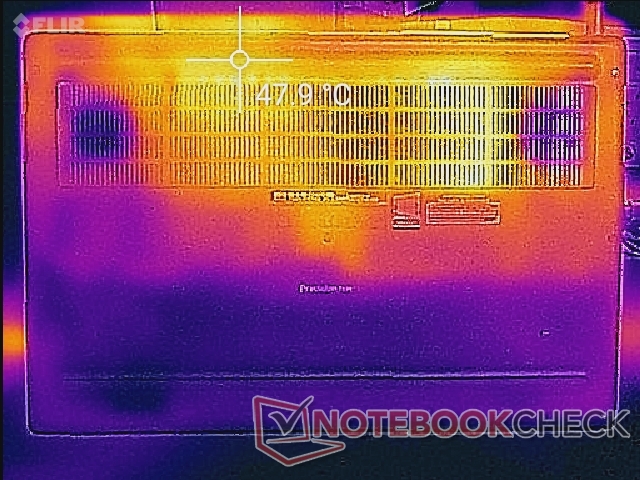 Le temperature di superficie sono più calde del previsto a quasi 40 °C quando si è al minimo sulla scrivania, probabilmente a causa delle ventole al minimo. Per fortuna, questo hot spot si trova sopra la prima fila o i tasti della tastiera e lontano dai poggiapolsi. La superficie calda non distrae durante l'uso, ma tenetevi pronti ai tasti caldi. Si noti che il lato della tastiera di questo particolare notebook sarà sempre più caldo in media rispetto alla parte inferiore del notebook, poiché i processori sono più vicini alla superficie superiore che a quella inferiore.