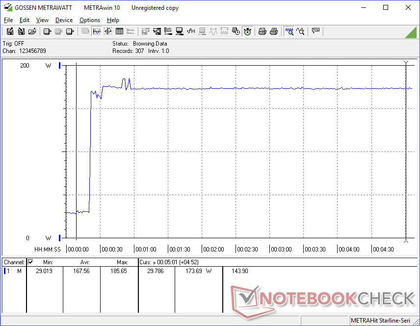 L'adattatore AC da 180 W di medie dimensioni (~15,4 x 7,5 x 2,3 cm) è in grado di alimentare a malapena il sistema. Siamo in grado di misurare un consumo energetico massimo di 174 W per suggerire che un adattatore AC da 200 W o 220 W più capace potrebbe essere stato più adatto per un maggiore sovraccarico.