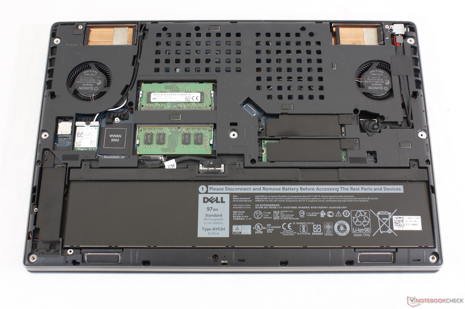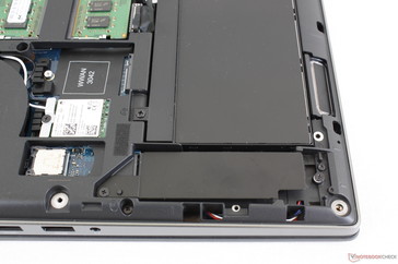 La manutenzione richiede solo un cacciavite Philips. Gli utenti hanno accesso diretto alle ventole di sistema, agli alloggiamenti, agli slot SODIMM, alla batteria, allo slot WWAN, allo slot WLAN e allo slot SIM. La nostra unità di prova non è compatibile con le schede WWAN e non ci sono antenne preinstallate se vogliamo installarne una noi stessi. La scheda madre tra le ventole del sistema è protetta da una solida piastra per una maggiore rigidità.
