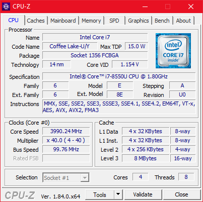 L'Intel Core i7-8550U i7-8550U è un processore quad-core ULV. La CPU ha una potenza termica di progettazione (TDP) di 15 W per impostazione predefinita. Le postazioni di lavoro sono generalmente dotate di processori da almeno 45 W. Il Core i7-8550U ha una velocità di clock di base di 1,8 GHz che può aumentare fino a 4 GHz quando richiesto.