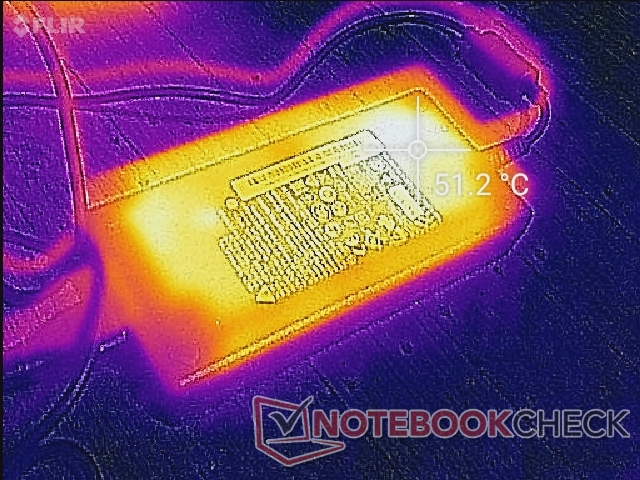Le temperature di superficie sono le più calde verso il centro della tastiera a quasi 41 °C quando sono sottoposte a carichi di lavorazione estremi. Al contrario, i punti caldi sulla maggior parte degli altri computer portatili si trovano in cima alla prima fila di tasti della tastiera, dove gli utenti hanno meno probabilità di essere toccati. Le temperature medie sono ancora più fresche rispetto a molte altre workstation da 17,3 pollici, inclusa la Dell Precision 7730. I supporti per i palmi, il touchpad e i tasti NumPad rimangono freddi indipendentemente dal carico di elaborazione.