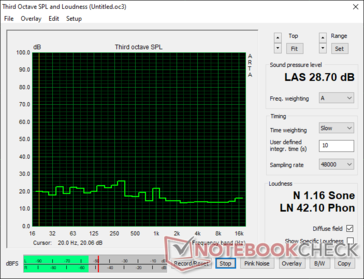 Poiché NVIDIA ha implementato una modalità di arresto completo della ventola con le schede Ampere FE, il livello di rumorosità (SPL) in idle è più o meno lo stesso del valore ambientale di 28,70 db(A) a una distanza di 20 cm dal case chiuso.