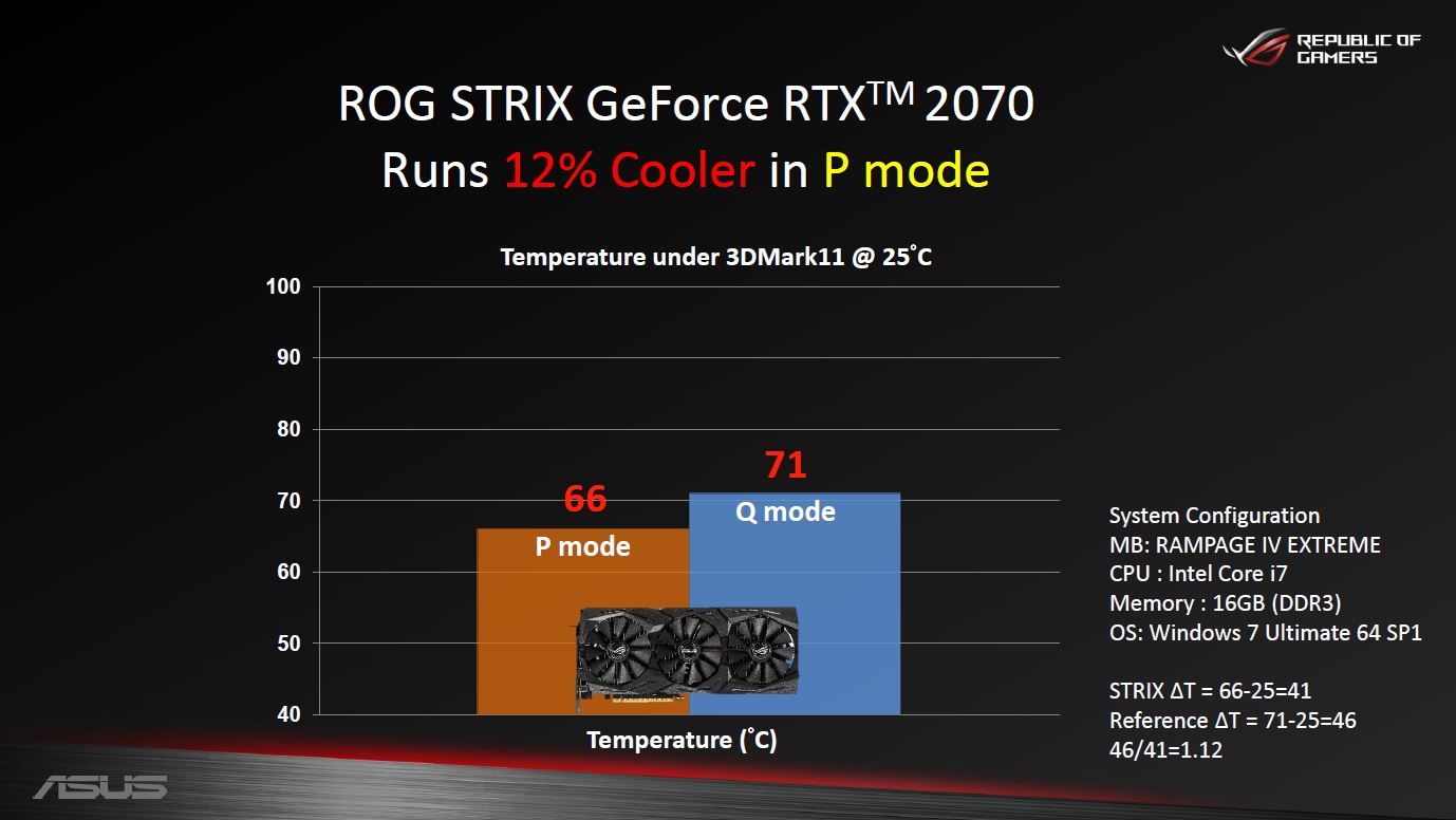 Asus ha notevolmente aumentato la velocità di clock delle sue GPU rispetto alla Nvidia's Founders Edition. La ROG RTX Strix 2070 OC arriva fino a 1.815 MHz quando è impostata sulla modalità di gioco, che è 105 MHz in più rispetto alla velocità di boost clock della Founder Edition. Il software Asus GPU Tweak II permette inoltre alla scheda di funzionare in modalità OC o silenziosa. La GPU aumenta di ulteriori 30 MHz in modalità OC e scende dello stesso valore in modalità Silent. La regolazione consente inoltre di regolare il target di potenza al 90% per la modalità Silent e al 110% per la modalità OC. Asus ha impostato il target di potenza al 100% per la modalità Gaming della scheda, che è la modalità in cui abbiamo condotto i benchmark.