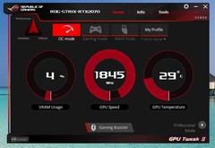 È possibile impostare manualmente velocità di clock superiori alla modalità OC, ma ciò non migliora le prestazioni. Il nostro dispositivo di prova può gestire stabilmente un core clock da 1.950 MHz e un VRAM clock boost da 800 MHz, avendo impostato i target di potenza e temperatura al massimo. I nostri sforzi non hanno avuto alcun effetto, poiché la scheda ha ottenuto punteggi identici nei benchmark sintetici. I nostri tweaks hanno aumentato il consumo energetico a 270 W anche sotto carico, il che è piuttosto inutile quando non c'è un beneficio tangibile nell'impostare la scheda in modalità OC.