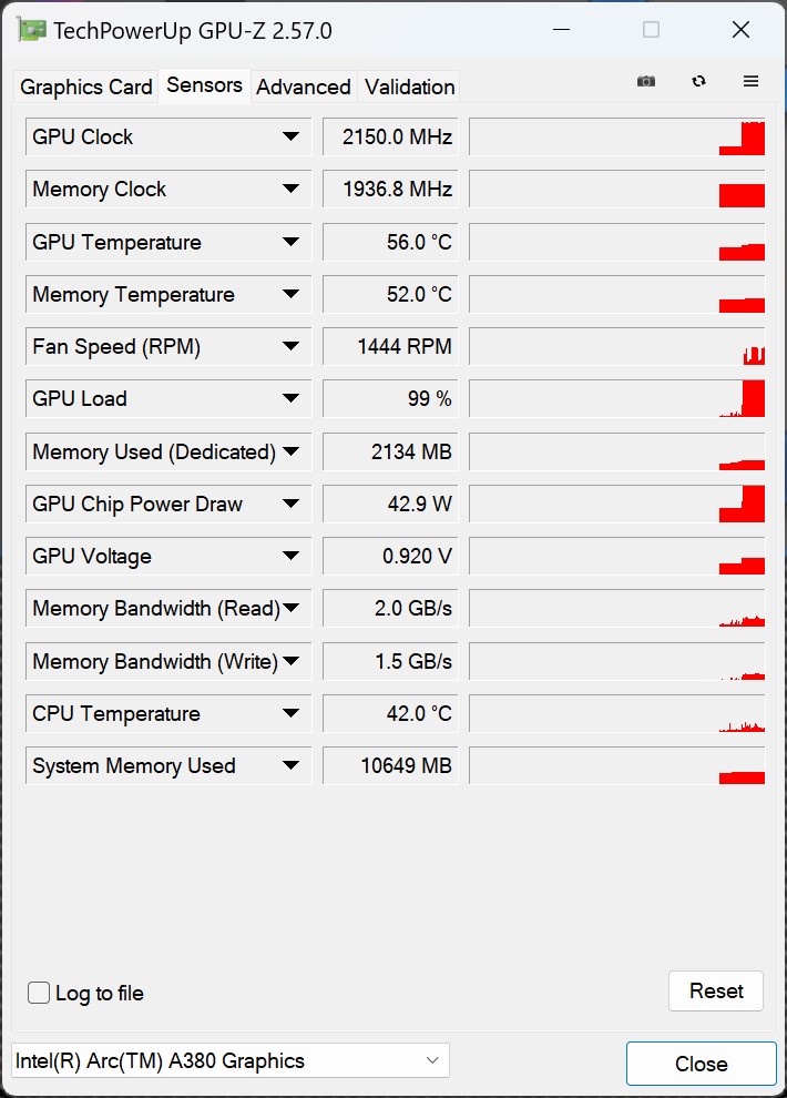 In termini di velocità di clock del chip grafico e della VRAM, Sparkle rispetta le specifiche di Intel. Sotto carico, raggiungiamo un boost della GPU fino a 2.400 MHz, sebbene questo cali sotto un carico più lungo, stabilizzandosi a circa 2.150 MHz. Il Power Target di Sparkle Arc A380 Elf è di 43 watt e non può essere aumentato ulteriormente.