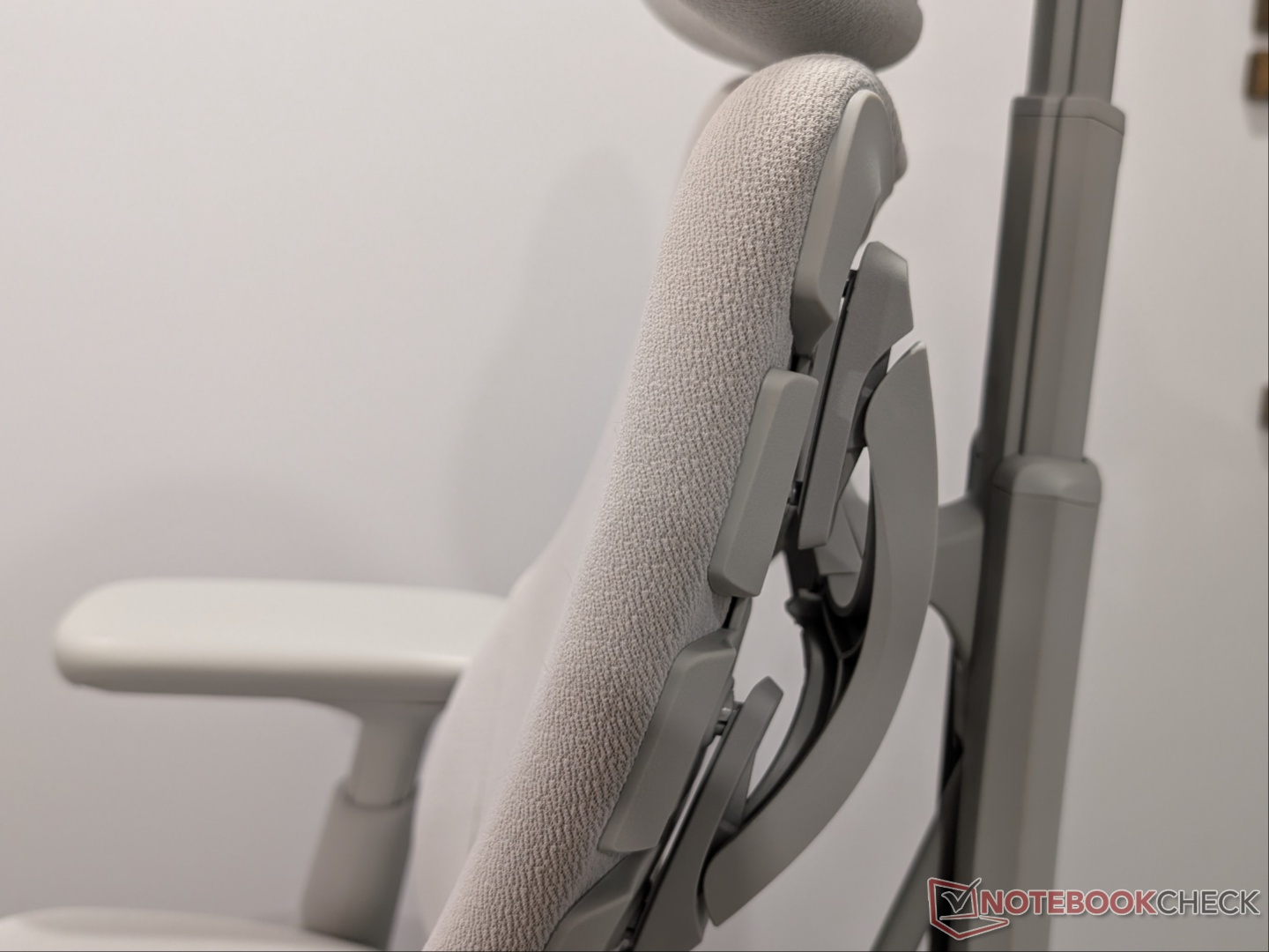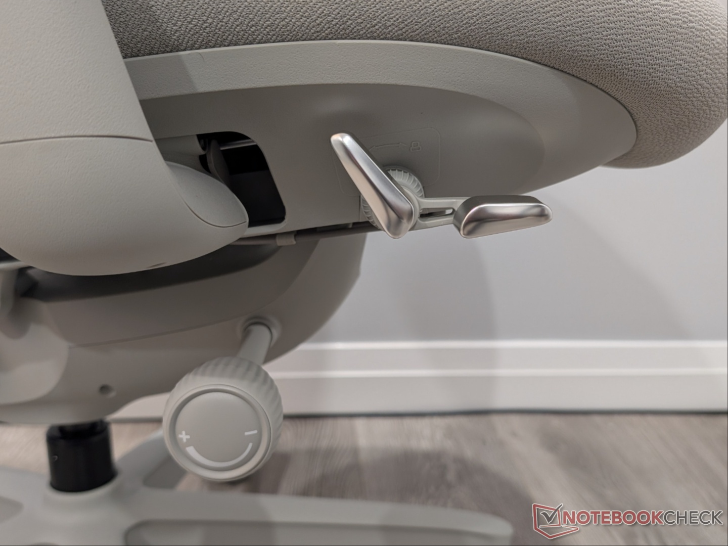 Ora, la star dello spettacolo, lo schienale e il supporto lombare. La base è un "materiale resiliente di un sedile di aereo" che presenta uno strato di spugna flessibile che allevia la pressione. La spugna è avvolta da una fibra elastica in micro-lino. Ho trovato la densità della schiuma confortevole e di sostegno, mentre il tessuto è morbido al tatto. Poiché poggia su un'unica colonna vertebrale, lo schienale si muove lateralmente con lei. Le funzioni di reclinazione standard sono presenti, compreso il blocco dell'angolo di inclinazione e la regolazione della tensione. Può essere bloccato a quattro angoli - 105, 120, 135 e 160 gradi - e lo schienale non si reclina oltre l'angolo impostato, cosa che ritengo migliore rispetto al blocco dello schienale all'angolo impostato. Ho letto commenti che dicono che la seconda posizione è troppo arretrata, ma a me non ha dato fastidio, perché l'ho trovata giusta. Tendo a reclinare al secondo livello, a spostare la sedia completamente in avanti e ad avere i braccioli in linea con la scrivania.