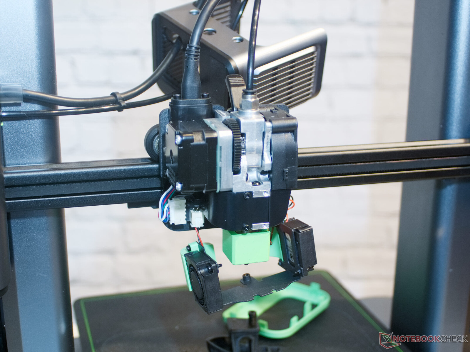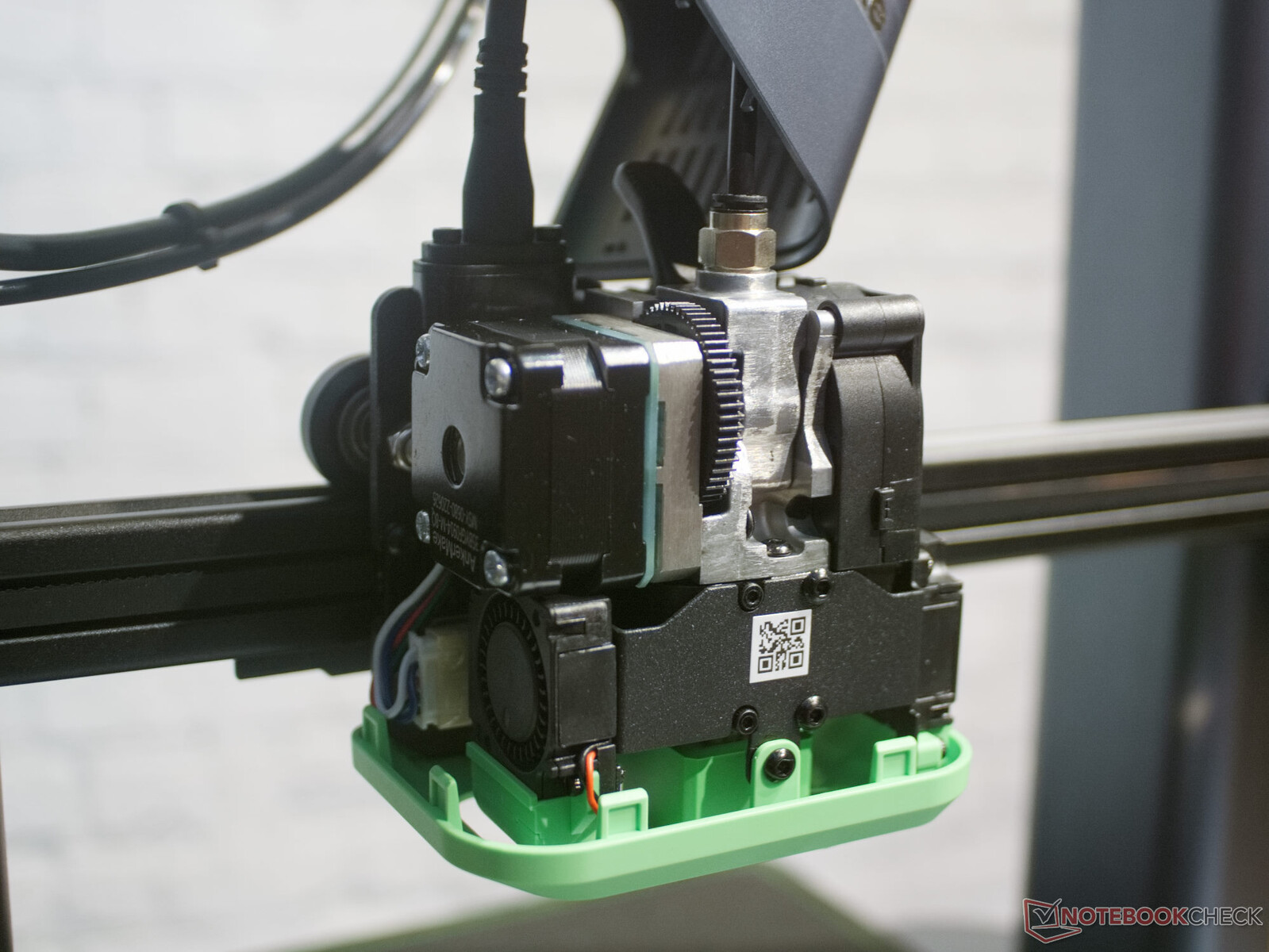 L'hotend AnkerMake M5 non utilizza quasi nessun componente standard. Con una dimensione di un centimetro, la lunghezza della filettatura dell'ugello si colloca tra MK8 e l'ugello vulcano. Anche il blocco di riscaldamento non ha dimensioni standard. Almeno il riscaldatore della cartuccia e il termistore sono conformi agli standard delle stampanti 3D. Con una capacità di riscaldamento di 60 W, la cartuccia di riscaldamento è sufficientemente dimensionata per le alte velocità che AnkerMake M5 dovrebbe essere in grado di raggiungere. La ventola di raffreddamento spinge l'aria verso il retro della testina di stampa. Pertanto, quando si stampa ASA o ABS, la stampante non genera una corrente d'aria lungo il piatto di stampa.