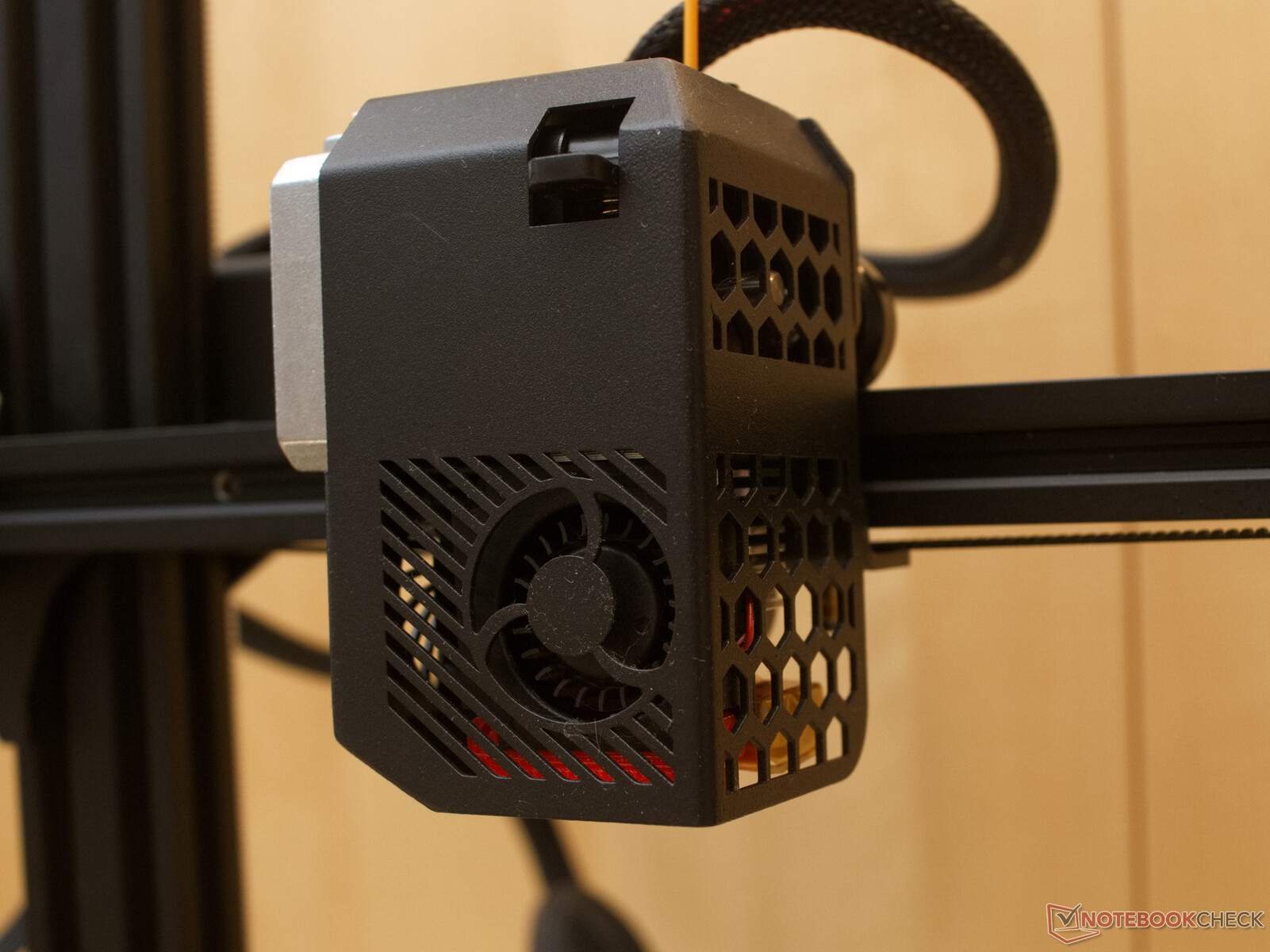 L'ingranaggio di azionamento dell'estrusore si trova solo circa 7 cm (~2,8 pollici) sopra l'ugello. Grazie al percorso breve, possono essere lavorati anche filamenti flessibili. Una ventola radiale assicura un adeguato raffreddamento del materiale estruso. Se si desidera, l'ugello rosso qui potrebbe anche essere sostituito da disegni propri.