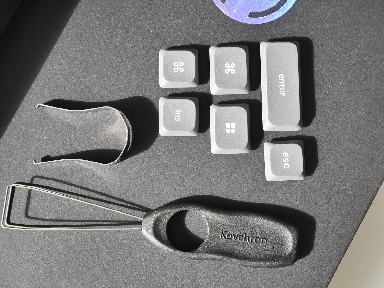 All'interno della scatola di Keychron K15 Max, che presenta un marchio minimo sulla parte superiore, si trovano Keychron K15, un estrattore di tasti a filo, un estrattore di interruttori in metallo piegato, un cavo USB Type-C intrecciato davvero morbido, anche se corto. Gli accessori inclusi sembrano abbastanza premium, soprattutto considerando il prezzo di Keychron K15 Max. Nella confezione c'è anche una manciata di keycaps extra per le configurazioni Mac e Windows, oltre a keycaps arancioni per gli accenti Enter ed Esc.