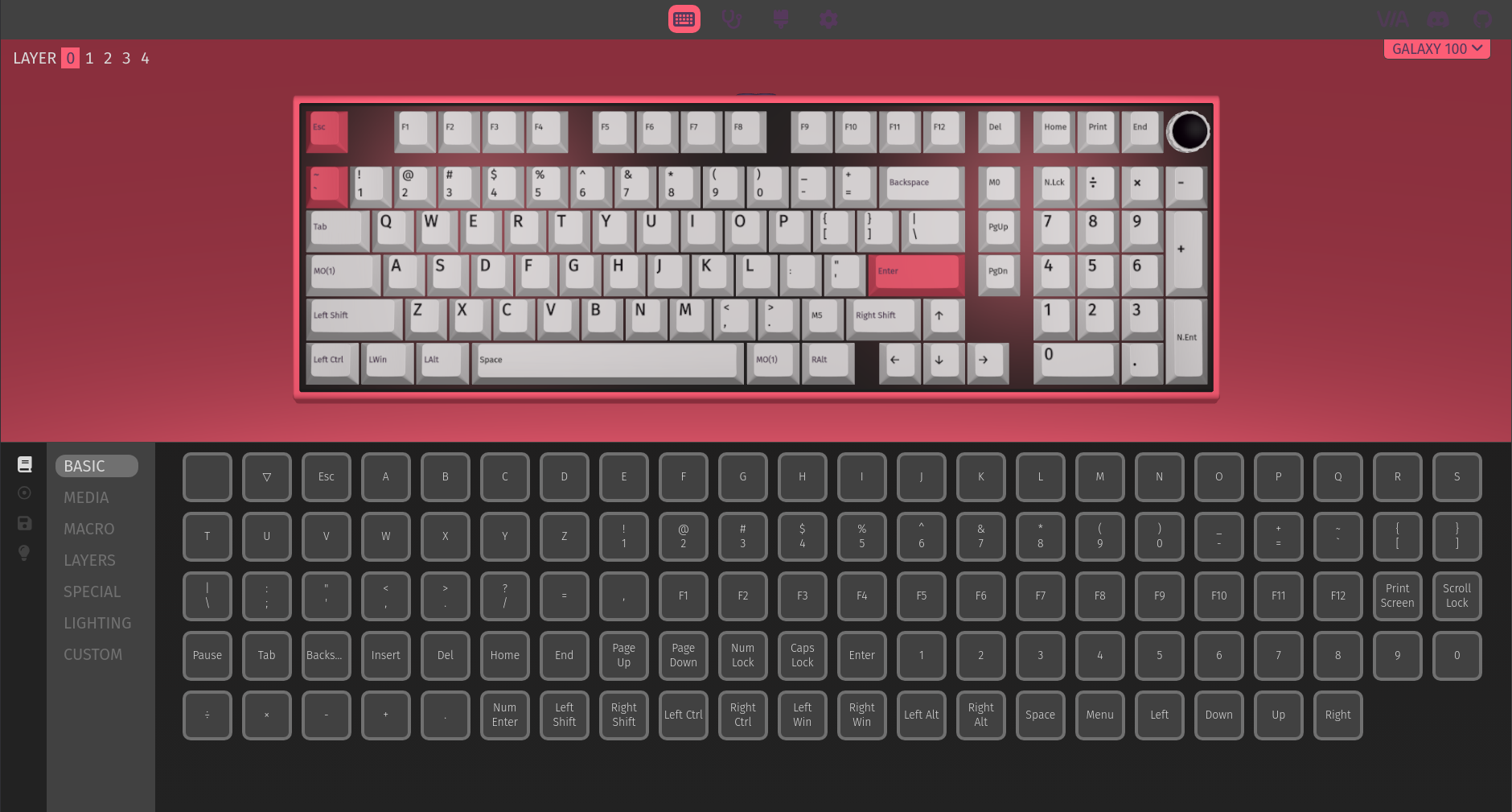 Oltre ai 15 slot macro, Galaxy 100 offre cinque livelli in totale da riconfigurare in VIA (0, 1, 2, 3, 4), il che non è sconvolgente rispetto ai 10 offerti da alcune tastiere, ma dovrebbe essere sufficiente se desidera assegnare un livello specifico per Mac o per il gioco. Nel complesso, la compatibilità VIA è ancora uno dei punti di forza di Galaxy 100, in quanto consente la personalizzazione su qualsiasi sistema che disponga di un browser compatibile con HID - quindi Linux, macOS e Windows - è solo un peccato che manchino alcune funzioni.
