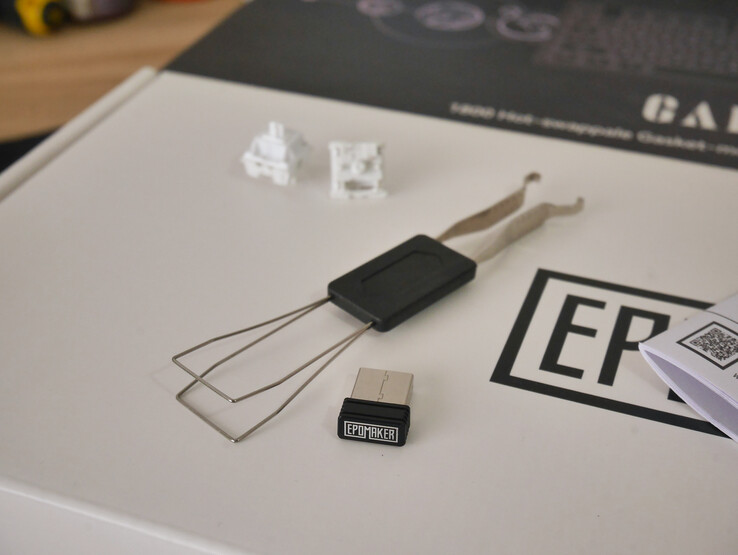 Le cose rimangono più o meno invariate sul fronte degli accessori, tuttavia. Non si ricevono ancora copritasti aggiuntivi per personalizzare i cluster di navigazione, ed Epomaker ha optato ancora una volta per un lungo cavo USB tipo-C non intrecciato nella confezione, insieme a un ricevitore USB tipo-A da 2,4 GHz, un interruttore combinato e un estrattore di copritasti, e due interruttori Feker Marble White extra nel caso in cui si rendano necessarie delle sostituzioni.