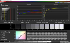 Gli utenti possono modificare la rappresentazione dei colori attraverso il menu del Reno2. Qui sono disponibili varie modalità. La parte blu è leggermente troppo alta e il rapporto di contrasto è relativamente basso rispetto all'impostazione standard. Mentre la porzione blu aumentata rimane nella modalità vivida, i colori appaiono molto più pronunciati grazie ad un rapporto di contrasto più alto. La modalità bilanciata riduce la parte blu, con il risultato di una temperatura del colore significativamente più calda.